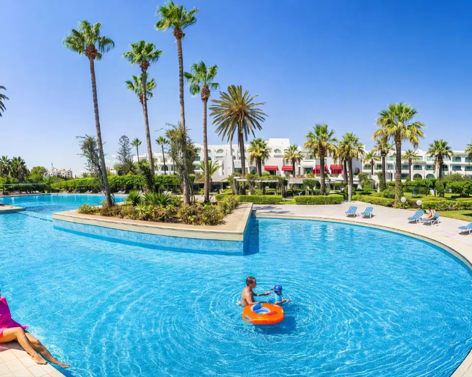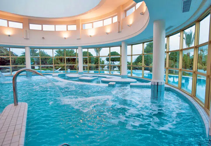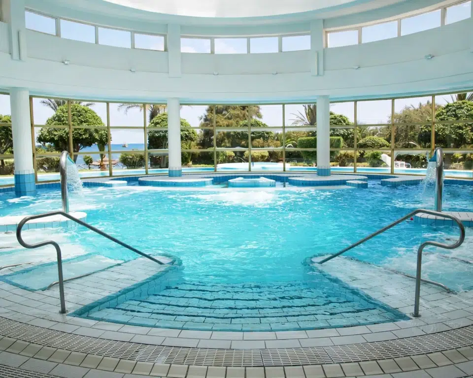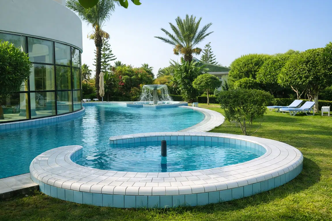 - 935m2(33m x21m)の優雅な屋外のプールは、0.85mから2.40mの深さおよび26°Cで維持される水と弛緩と水泳間の理想的なスペースを提供する。