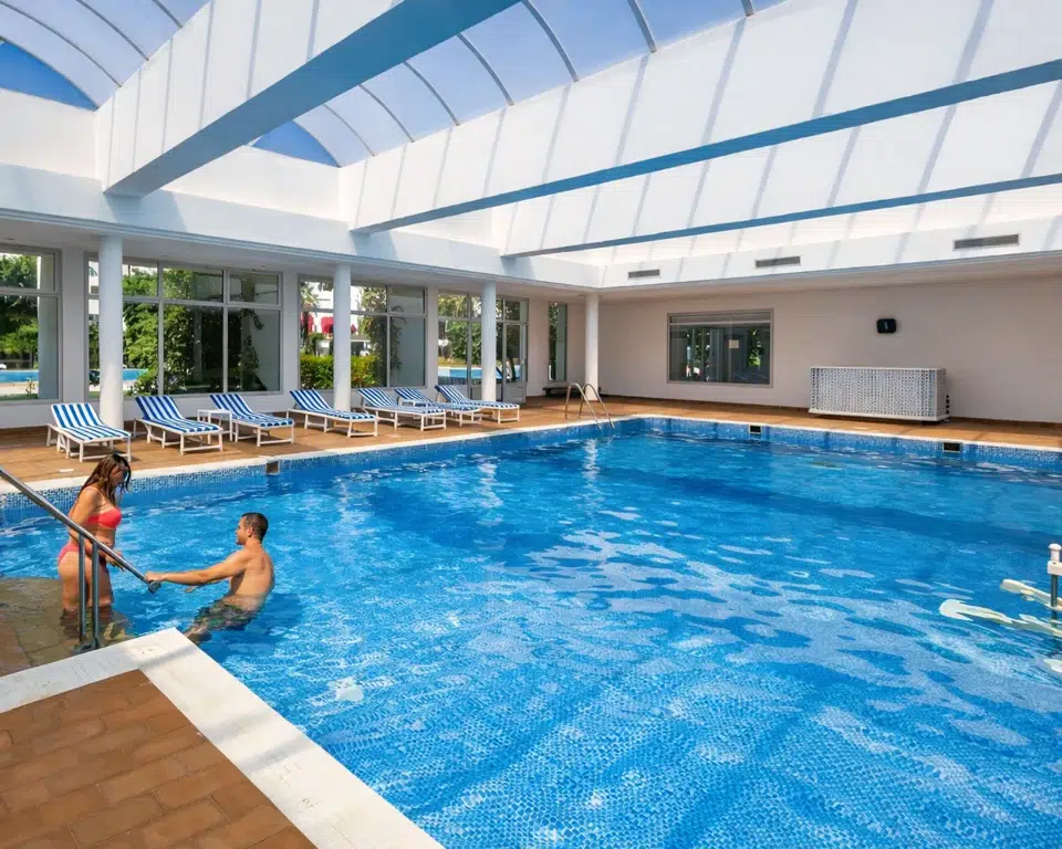 - 91m2の表面が付いている屋内プール、長さが13.23mおよび幅の6.88mを測定する。 深さは0.85mから弛緩および水泳両方のために適したスペースを提供する2.40mまで変わる。