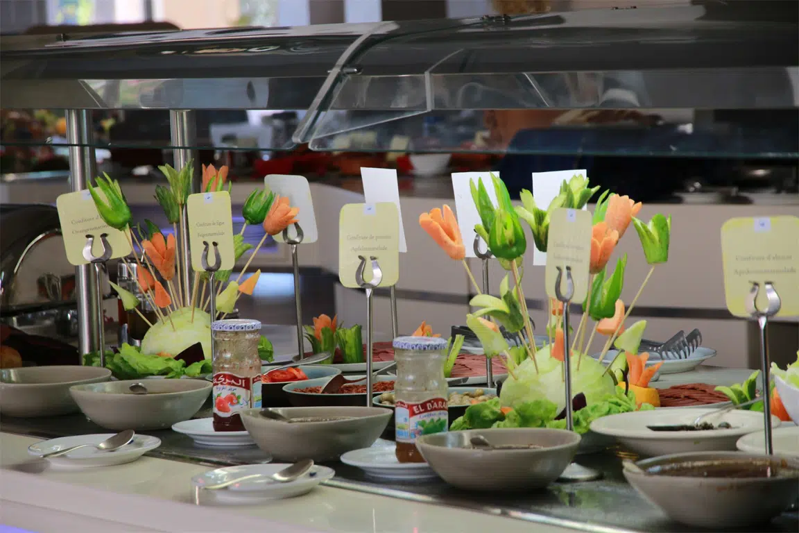 Un large choix de produits frais, plusieurs variétés de viennoiserie, des jus de fruits, des boissons chaudes, dans notre restaurant de petit-déjeuner l'Amilcar donnant sur le jardin luxuriant de notre hotel.